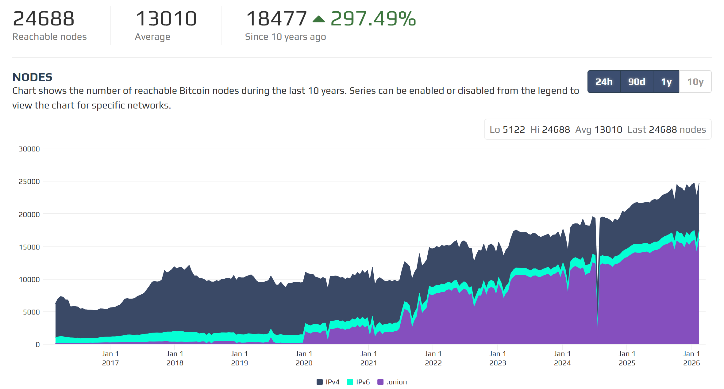 以下の図は、Bitnodesが観測している過去10年間のビットコインノード数の推移になります。到達可能なビットコインノードは2026年2月末現在で約24,688台が確認されており、年々上昇していることが見て取れると思います。