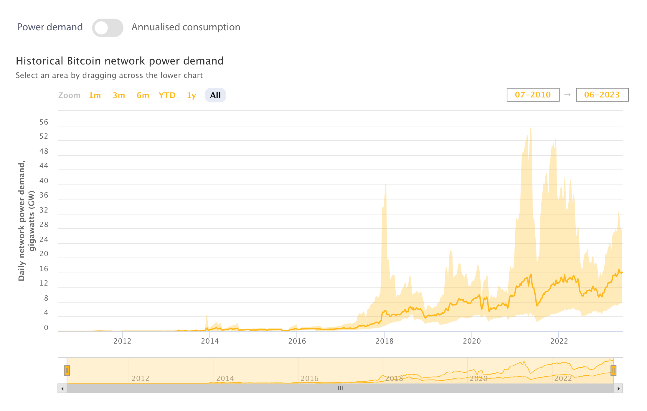 以下のグラフは全マイニングマシンが消費している電力です。仮定しているマイニングマシンの違いやマイニング施設の運用方法によって実際の消費電力の推定値には幅があり、その範囲が薄い色で示されています。そして、その中で比較的もっともらしい仮定を採用したときの推定値を濃い細い線となっています。グラフをみてみると、2017年から消費電力が徐々に上昇し、特にバブル期には大きな電力を使っていることが分かります。2023年6月現在は消費電力は上昇傾向にあるようです。