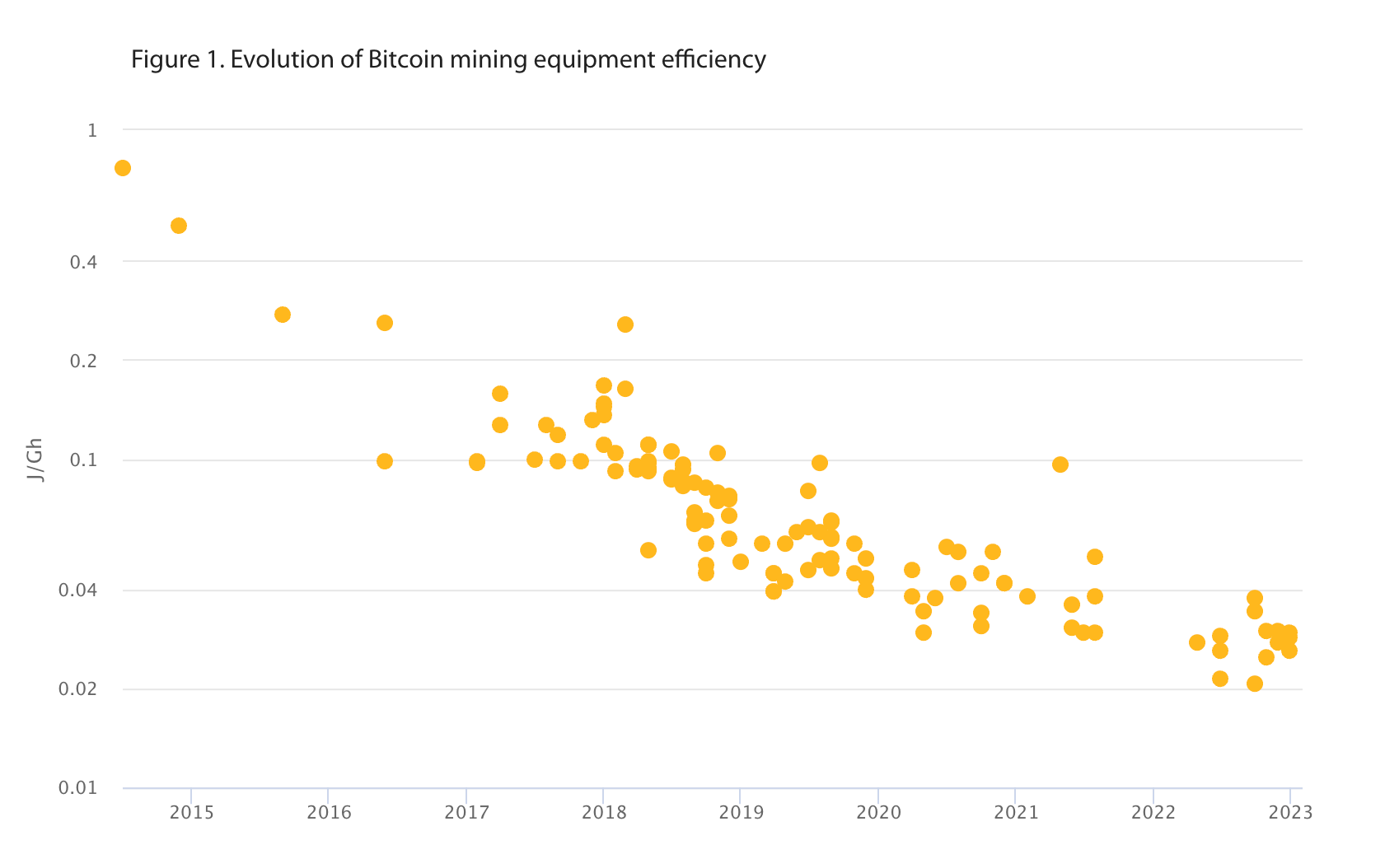 ビットコイン黎明期の2009年当時は、マイナーはCPUによって(そもそもビットコインに価格がついていなかったので)利益度外視でマイニングをしていました。そのころのマイニング効率はIntelのCore i5-650を仮定して計算しています。そして、その後は汎用的なGPUやFPGAを使ったマイニングが主流となりました。2013年までは、GPUやFPGAを用いたマイニング効率を用いており、データは研究結果[Taylor, 2016]から得ているようです。現在ではGPUやFPGAはもはや採算が合わず、専らASICが使われています。ASICに主流が移ったあとのマイニング効率については、https://www.asicminervalue.com/ を利用しているようです。実際には使用環境やオーバークロックで多少変動するので、専門家の助けを借りてデータに修正を加えており、http://sha256.cbeci.org/ に内容が記載されています。計算されたマイニング効率の変化については以下のグラフにまとめられています。このデータだけでも非常に興味深いです。