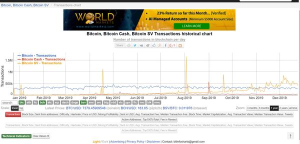ちなみにbitinfochartsによれば、平均してBCHはTx数はBTCの10分の1程、BSVはここしばらくBTCよりトランザクションが多い状態が続いています(添付画像①)