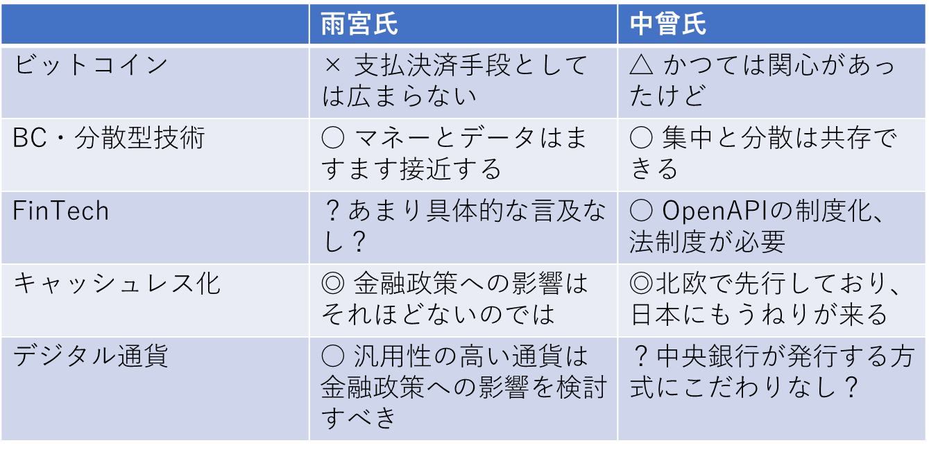 一方でキャッシュレス化については進展していくとみており、中曾氏と同様、関心は多くあるようでした。一方、中央銀行が発行する、いわゆるデジタル通貨については、金融政策にどのような影響を及ぼすかを研究する必要があると考えているようです。