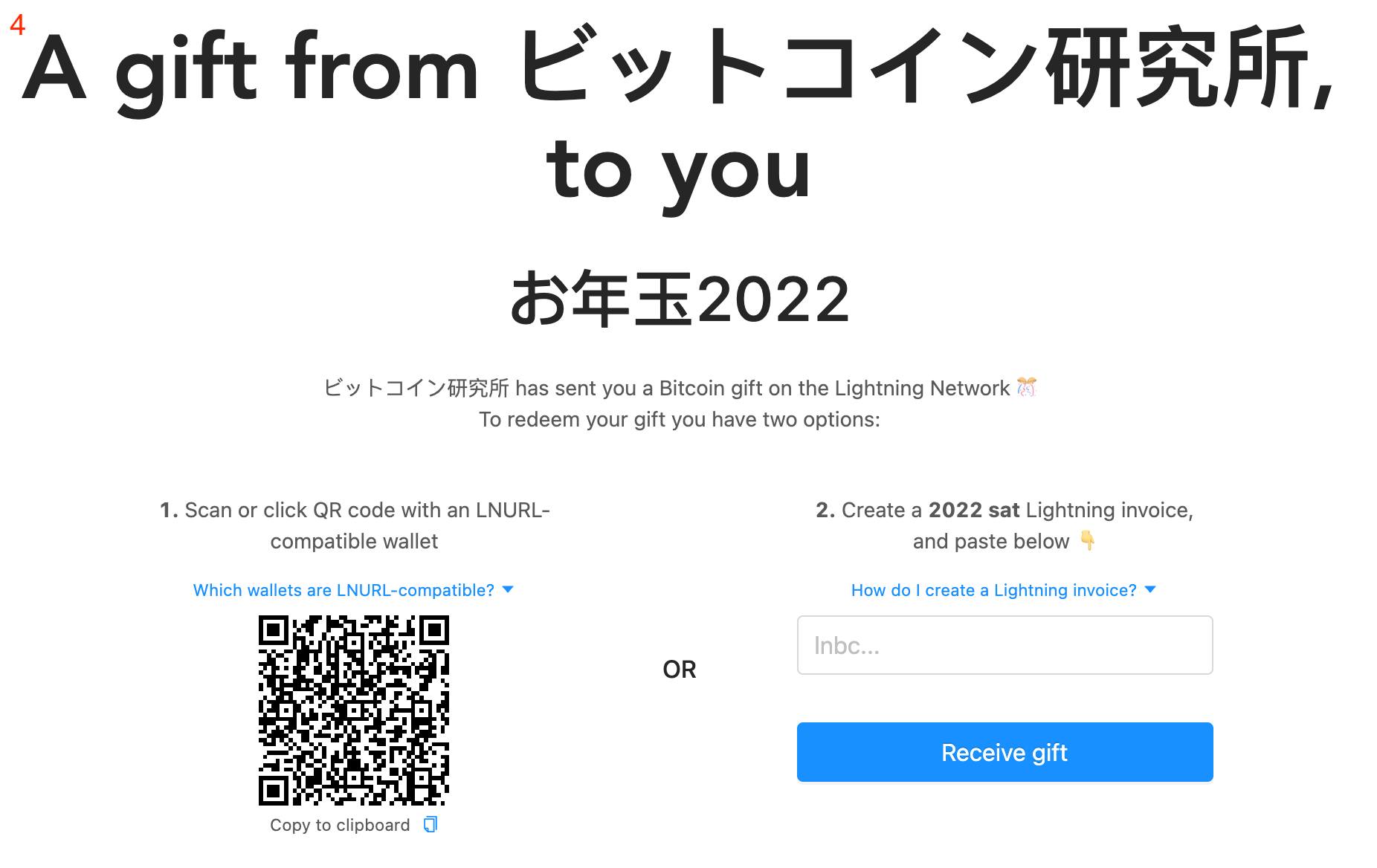 画面4:ギフト(URL)を受け取った人は、そのURLを開き、表示されたQRコードを自身のウォレットで読み取り、受け取り完了(上手くいかない場合は自身のウォレットで2022sats受け取るインボイスを作成し添付)