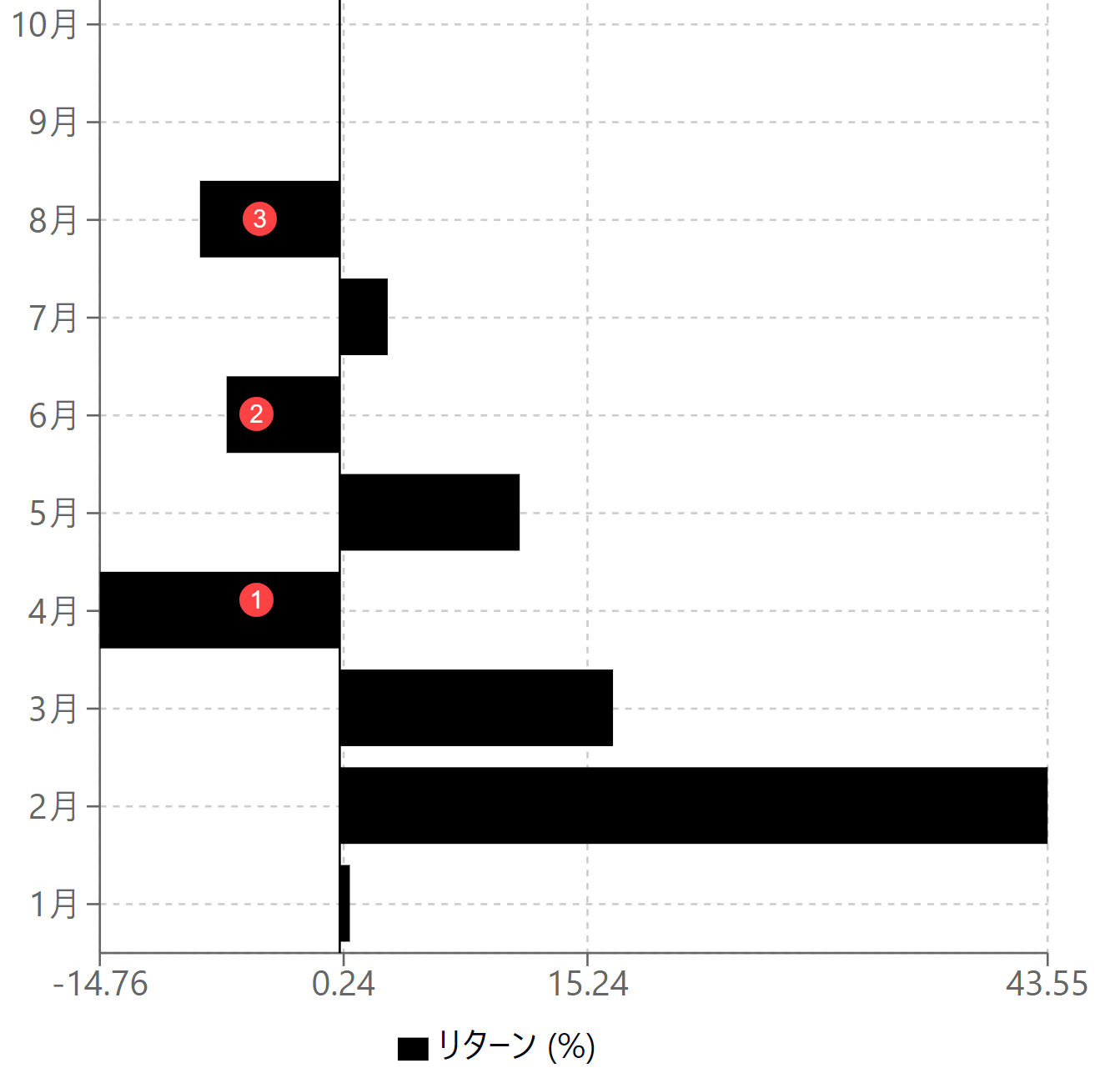 上昇傾向の続くビットコインにおいては、マイナス月次リターンの方が少数派となります。その少数派うち、2024年実績でマイナスを記録しているのは、①4月②6月③8月の3カ月です。