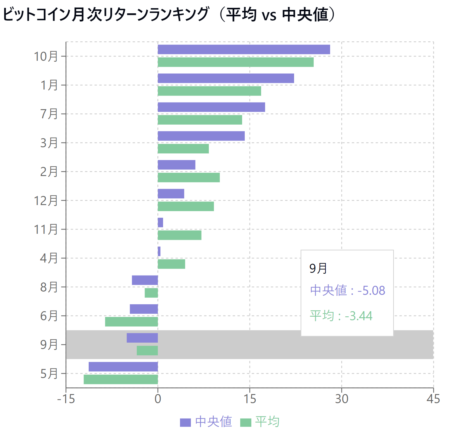 半減期を経た後の価格同行アノマリーは母数が小さく評価がむずかしいんですよね。そこで次善の策として、ビットコインの月次リターンという「アノマリー」を確認していきたいと思います。