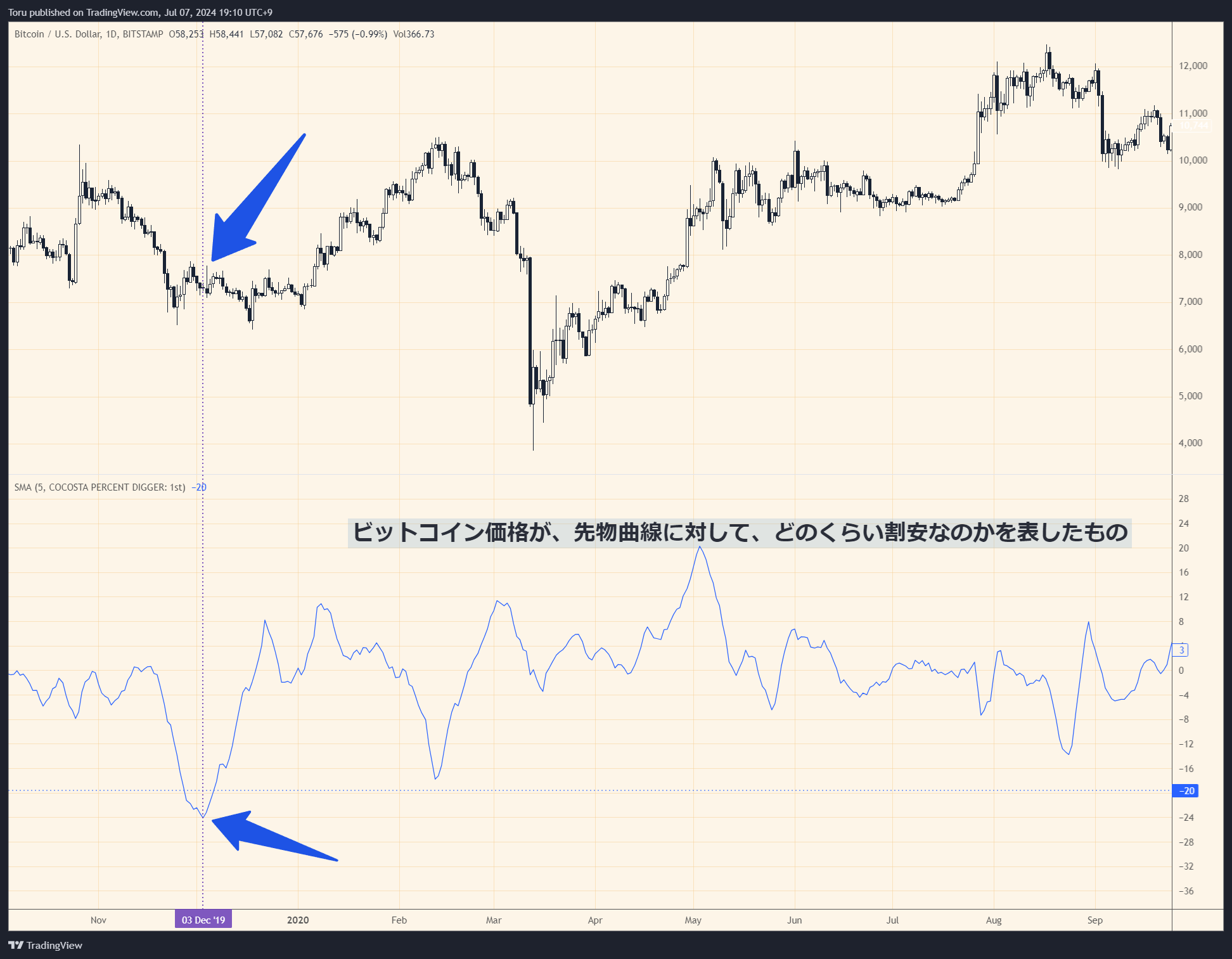 こちら、割安度でダントツの1位だったのが2019年12月初旬ですね。ビットコインはこのとき、奪還していた1万ドルを割り込んでいました。以下は拡大図です。