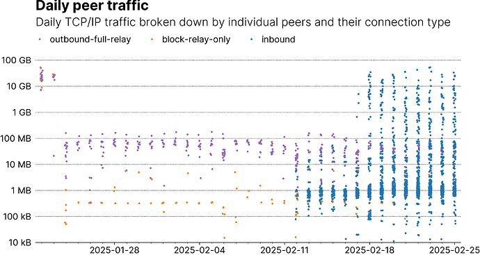 それまで自ノードから接続しにいったピア(Outbound Peer)との通信量は1日あたり10~100MB程度のものがほとんどで、Reachable移行後もその水準で推移していますが、Unreachableになってから向こうから接続してきたピア(Inbound Peer)の多くは1日わずか1MB前後しか通信していないことが可視化されています。