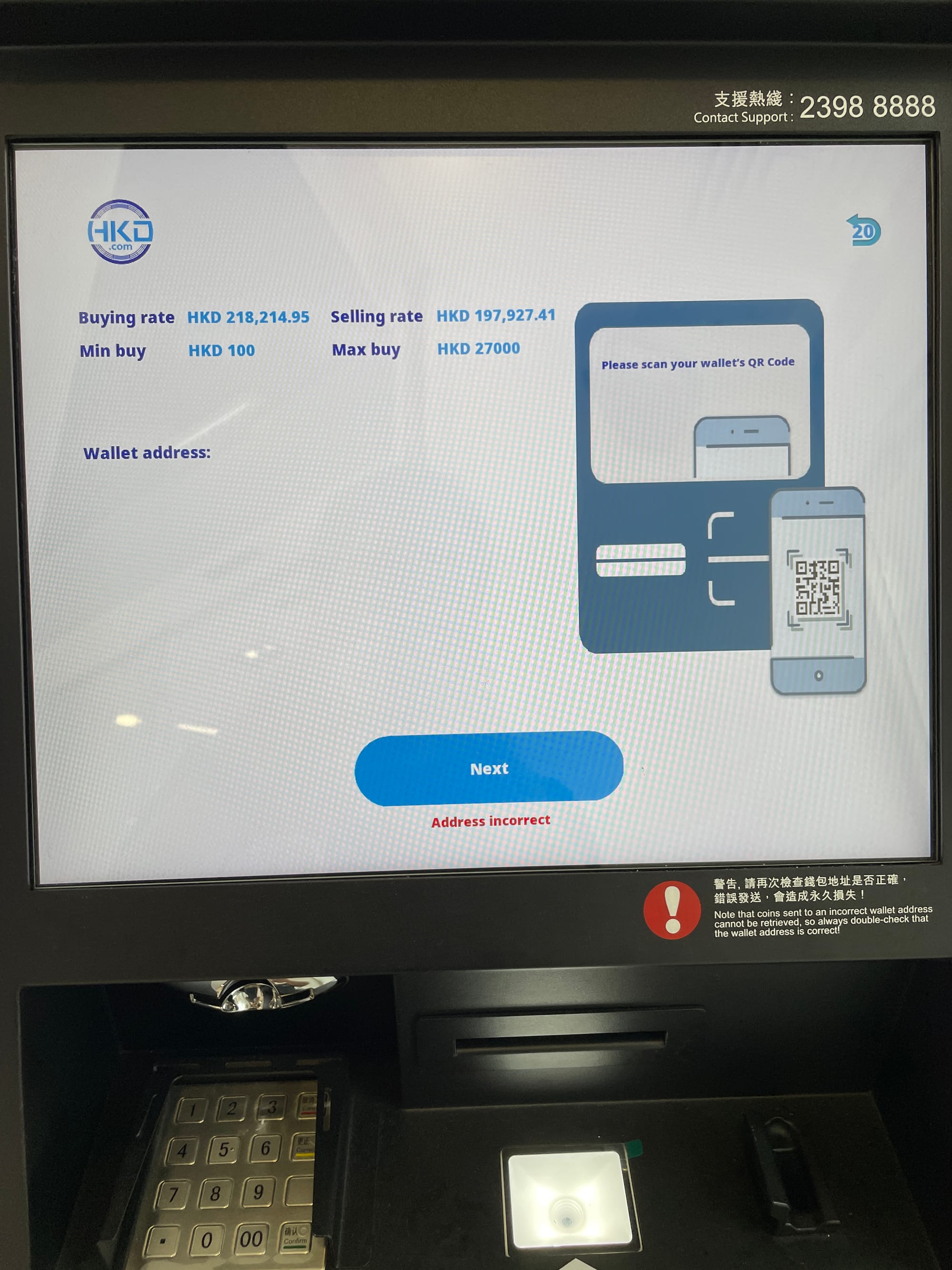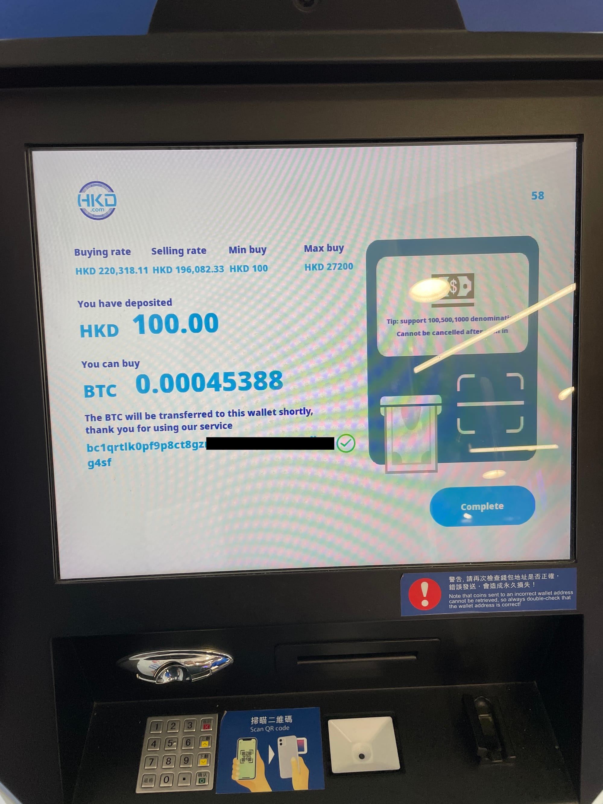 今回は香港ドルをビットコインに交換してみました。質問にあったように暗号資産から法定通貨への交換ではなく、その逆になります。スマートフォンに入っているウォレットに入金しますので、スマートフォンでビットコインアドレスを表示してATMのカメラで読み取ります。一度に最大で27,000香港ドルまで交換ができるとのことですが、日本円にして52万円程度ですね。あとスプレッドもなかなか大きめです。