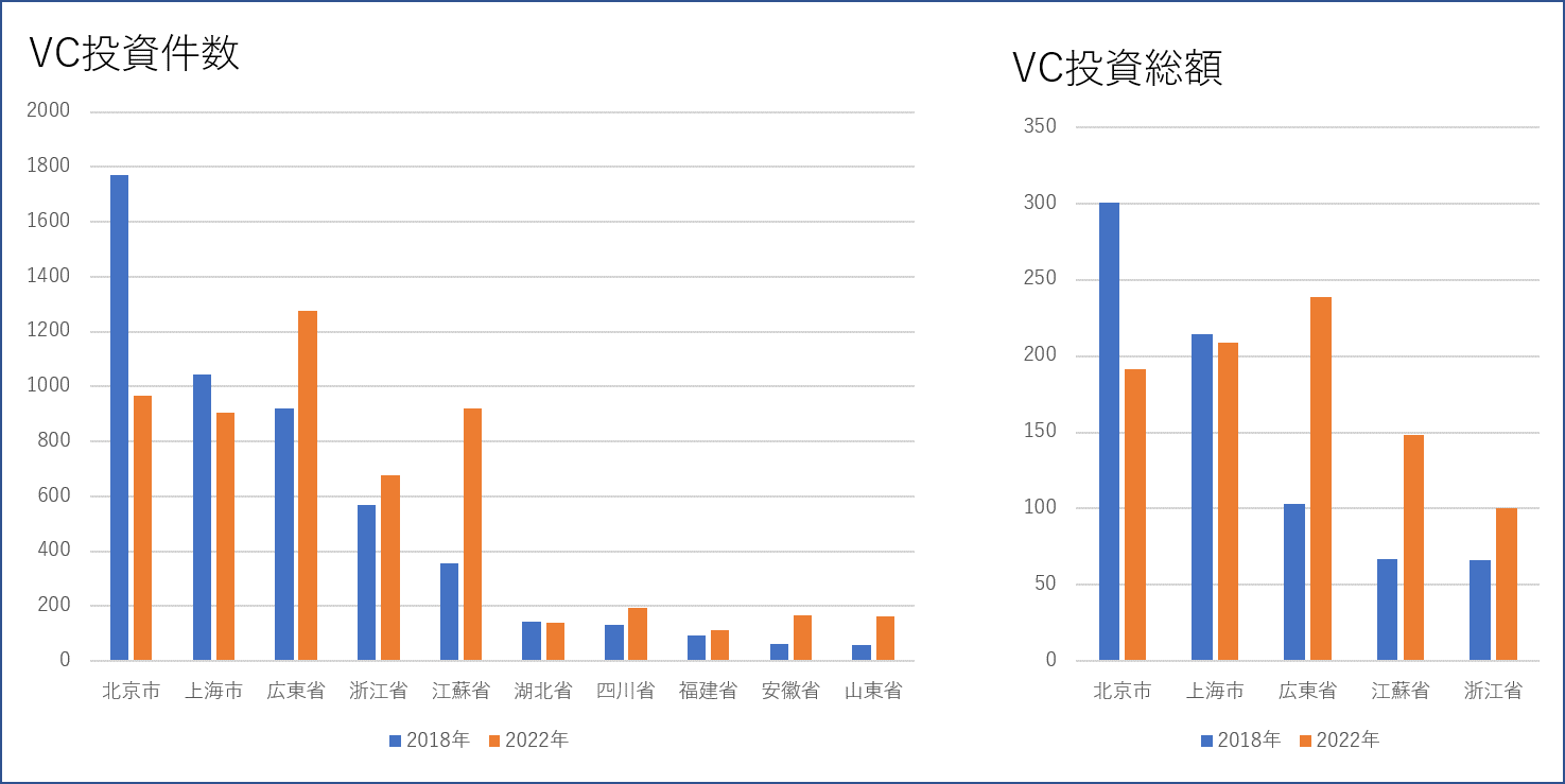 中国のシリコンバレーというと、深圳というイメージを持たれる方も多くいらっしゃると思います。しかし、2018年のVCの投資額を見ると、北京が1位になっていて、深圳を含む広東省は3位になっています。ユニコーン企業の集積も北京は1位になっており、パンデミック前は活気があったようです。2022年のデータでは北京、上海ともに経済回復が遅れているようですが、今後少しずつ回復するかもしれません。