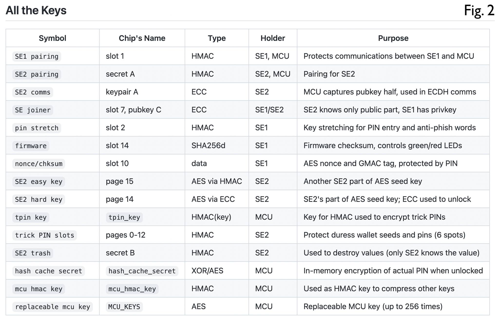 ColdcardはこれまでセキュアエレメントとしてMicrochip製のATECC609シリーズを搭載していましたが,Mk4ではもう1個セキュアエレメントを搭載するようです。Mixim(現在はAnalog Devicesの傘下に入っているアメリカの半導体メーカー)のDS28C36Bというチップです。データシート(https://datasheets.maximintegrated.com/en/ds/DS28C36.pdf)を見てみると,ECDSAによる暗号化やハッシュ関数,乱数発生器などを搭載しています。残念ながらsecp256k1には対応しておらず(対応しているのはsecp256r1),セキュアエレメント内部でのトランザクションの署名はできないようです。GitHubのリポジトリのドキュメントにはMk4のセキュアエレメントの使われ方について記載がされています(https://github.com/.../blob/mk4/docs/mk4-secure-elements.md)。Fig. 2に抜粋しました。