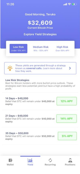 文末左図は「yield」戦略選択画面です。利用者はまず、自分のリスク許容度に合わせて、低リスク、中リスク、高リスクの選択をします。各リスクのページには、満期日、行使価格、年率換算の期待利益率の異なるオプションが表示されます。各オプションをクリックすると、図のように、戦略詳細とともに、満期日時にビットコイン価格が行使価格を下回る(オプションが行使されない、ビットコインを売却しなくて済む)確率が表示されます。