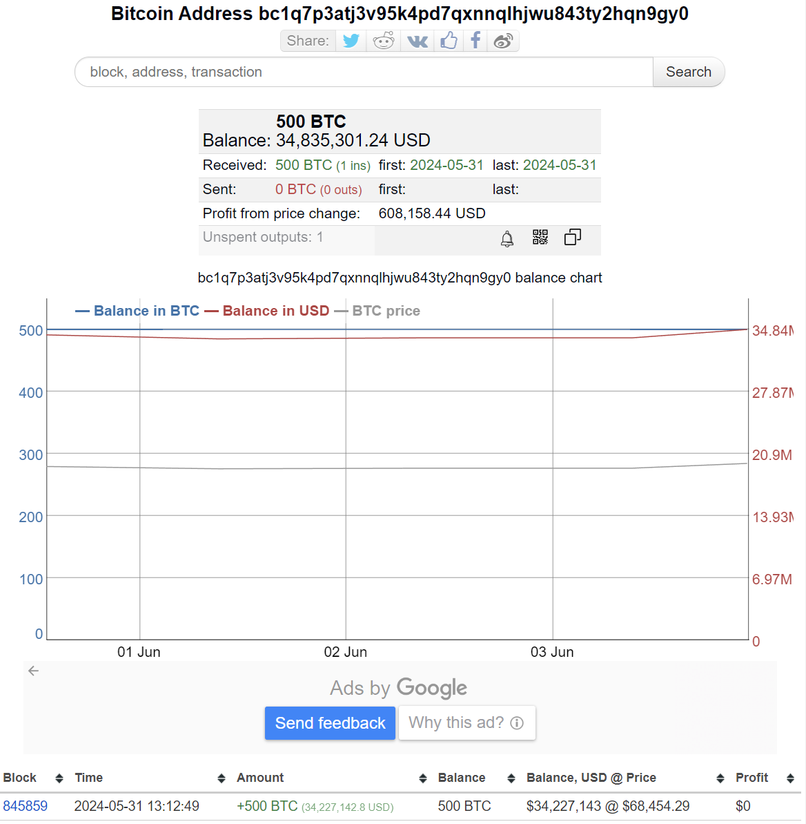 https://bitinfocharts.com/bitcoin/address/bc1q7p3atj3v95k4pd7qxnnqlhjwu843ty2hqn9gy0
