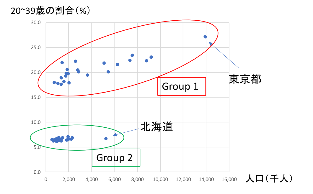 下の図1を見ていただきたいです。横軸は住民全体の「人口」で、縦軸は全体人口に対する「20~39歳の人口の割合」を表しています。