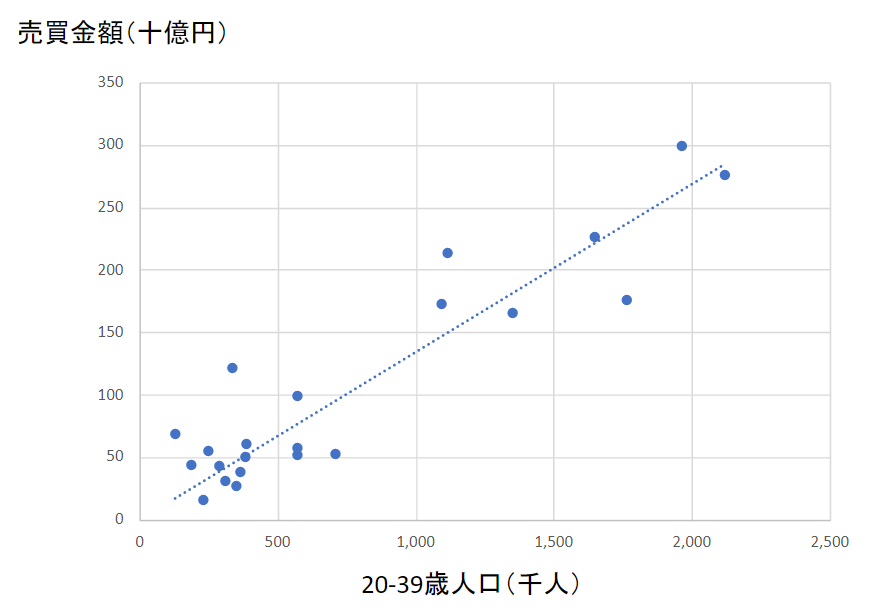 東京都は非常に大きな取引量が行われており、その他の地域と異なる特徴を持っています。下の図2は、Group 1のうち東京都を除いた23府県のうち、売買データが存在している22府県についてプロットしたものです。取引量は人口に比例すると考えれば、右上がりの直線(点線)であらわしたような関係になります。