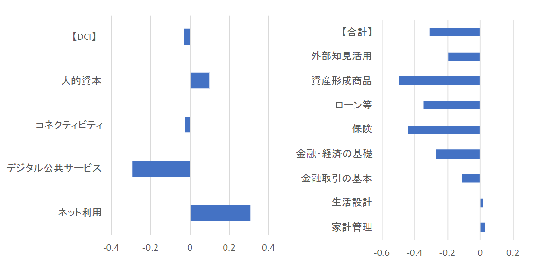【地域効果】と、デジタル度や金融リテラシーとの間に相関があるかどうかをチェックしてみました。図3を見てください。