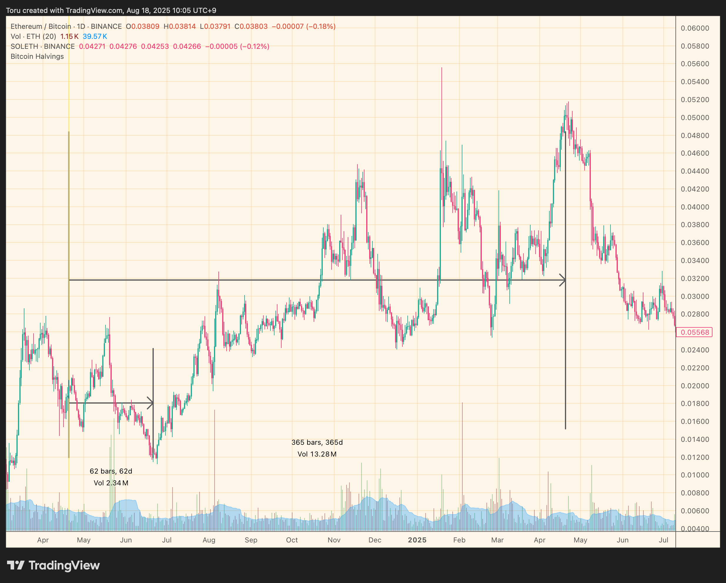- 上昇を開始したETHBTCは、およそ半減期から1年後程度まで上昇を続ける