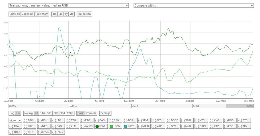 ちなみに、年初からの各チェーンのUSDTの送金額の中央値を比較するとUSDT_OMNIが約1000ドル、USDT_ETHが約850ドル、USDT_TRXが約200ドル、また7/1と比較してUSDT_ETHの中央値がおよそ3倍、USDT_TRXがの中央値がおよそ2倍になっていることがわかります。7/1まではきれいに棲み分けされていましたが、USDT_ETHがUSDT_OMNIに肉薄していますね。