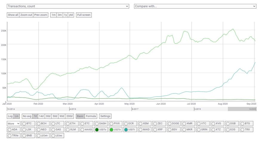 Coinmetrics.ioで年初からの各チェーン上のUSDTの送金件数を比較すると、夏からUSDT_TRXの伸びが顕著で、7/1比で現在は4倍に増えています。