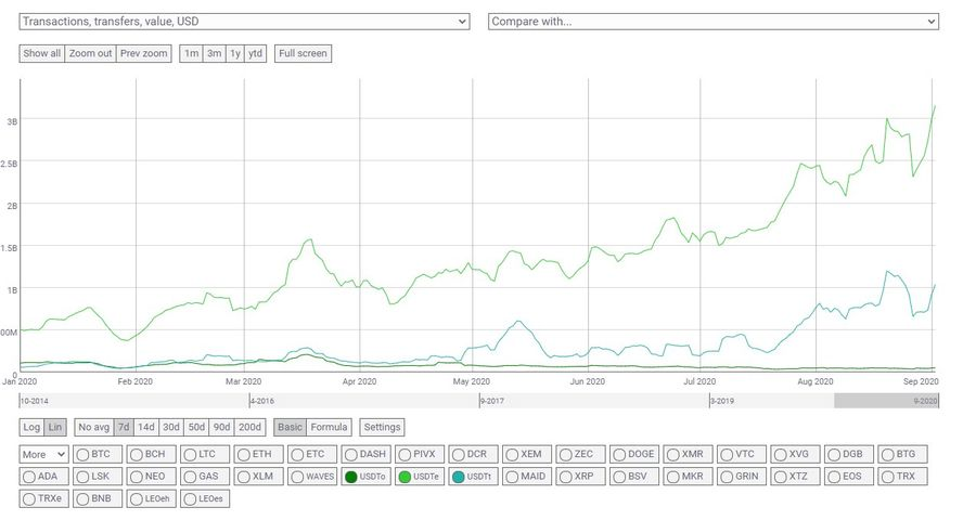 また、テザー社は時折チェーンスワップと称して各ブロックチェーン間を乗り換えていますが、イーサリアムの手数料の高騰にも関わらず8月にも10億USDTをトロンからイーサリアムへと移しています。チェーンスワップの理由は恐らく流通量の確保なので、CompoundのUSDT対応などによって流通量が減ったことの表れかもしれません。