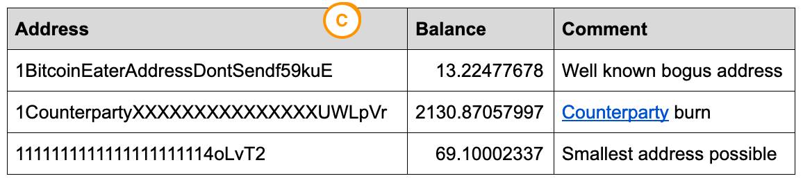 また、“bogus address”、“vanity address”と呼ばれる秘密鍵が不明のアドレスにロックされてアクセス不能なビットコインもあります。文末の表Cは有名なbogus addressとその残高です。3アドレスだけで2,200 BTCにもなります。