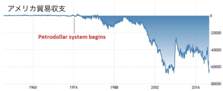 さらにアメリカは、他国に対する貿易赤字を膨らませることで、世界経済に十分なドルを供給し続けなければなりません。チャートはアメリカの貿易赤字がペトロダラーシステム開始以降、急増したことを示します(出典: Trading Economics)。ただ、世界に供給したドルの多くは、最終的に他国の中銀が準備金として米国債を買うことでアメリカに還流します。アメリカは世界各国から欲しいものを好きなだけ買い集めて債務を増やし、その返済を他国に押し付けることができるのです。他国には真似できない特権です。