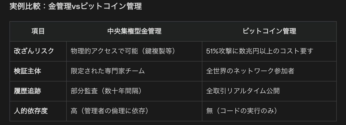 一方、ビットコインは数学的アルゴリズムと分散型ネットワークによって、人間の介入なしに資産の検証と保全を実現しています。