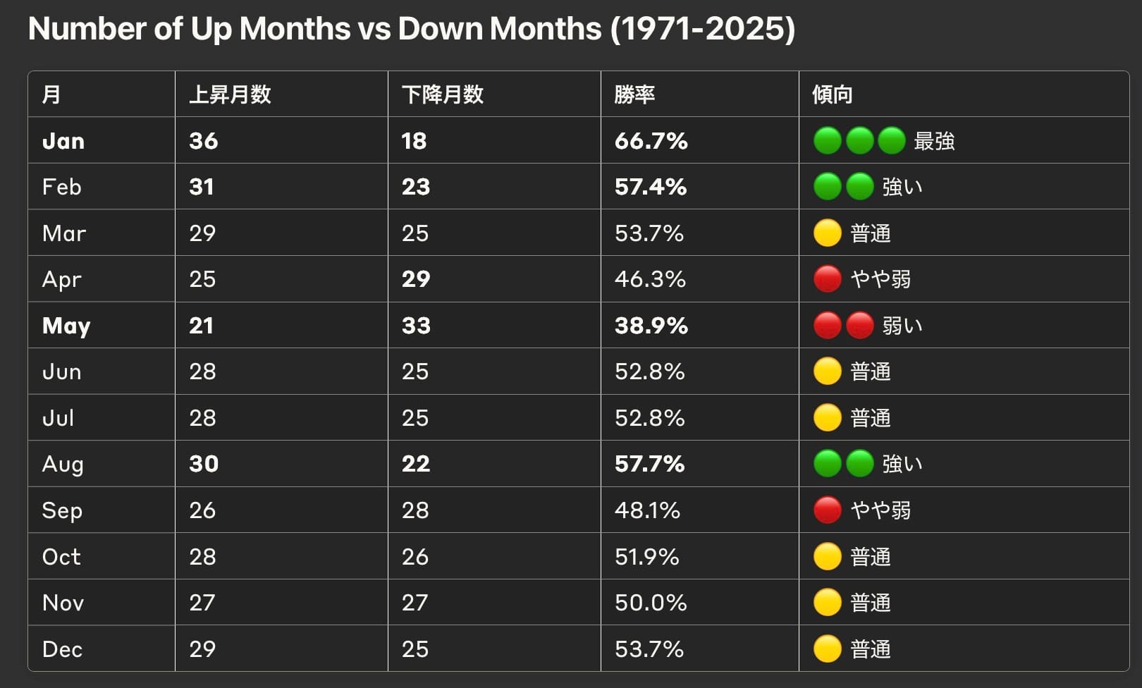 【表2:月別勝率分析(1971-2025)】