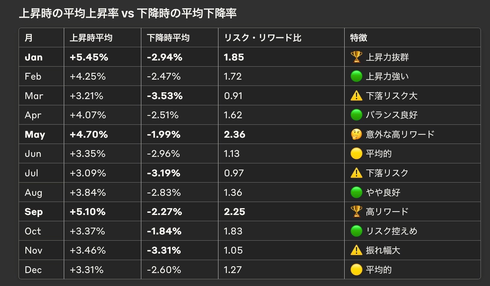 これは**"Sell in May"**の格言通り下落しやすいものの、上昇する時は大きいという特性を示しています。