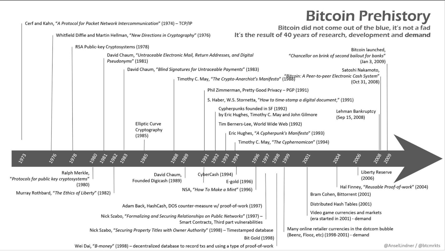 ビットコインにつながる技術を1970年代から列挙したAnsel Lindner 氏による “Bitcoin Prehistory”(ビットコイン前史)というタイムラインを見れば、そうでないことがよくわかります。以下、Lindner 氏がタイムラインに添えたメッセージです。