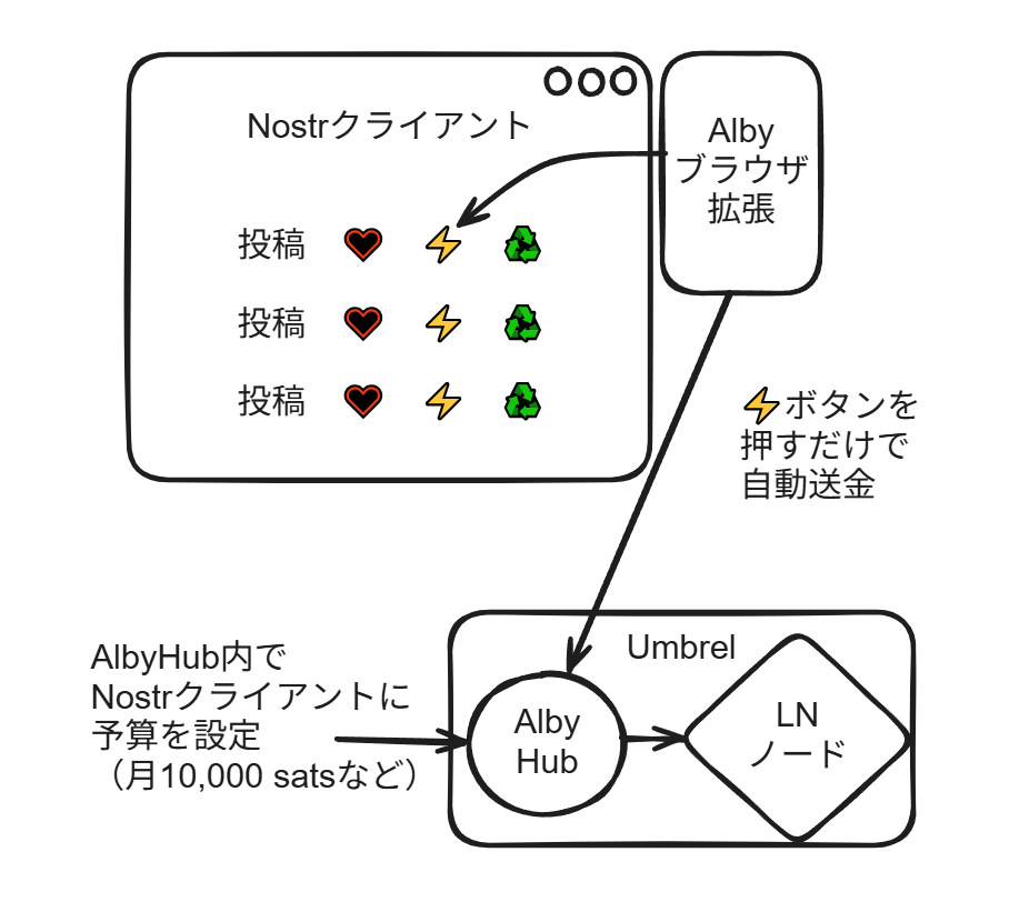 例えば、NostrクライアントのページでAlbyのブラウザ拡張を連携し、予算を与えると、その予算を超えるまでは毎回確認されることなくブラウザ内のボタンを押すだけでZap(投げ銭)が行えます。