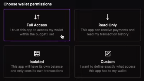 設定できる権限はいろいろあり、予算内で代理送金を認めるようなものから受取り専用、トランザクション履歴の閲覧が制限されるものなど様々な設定ができます。これで「ブラウザ拡張からは10万satsしか使えない」「このゲームでは獲得したsatsの受取りだけできる(送金はできない)」のような権限管理ができます。