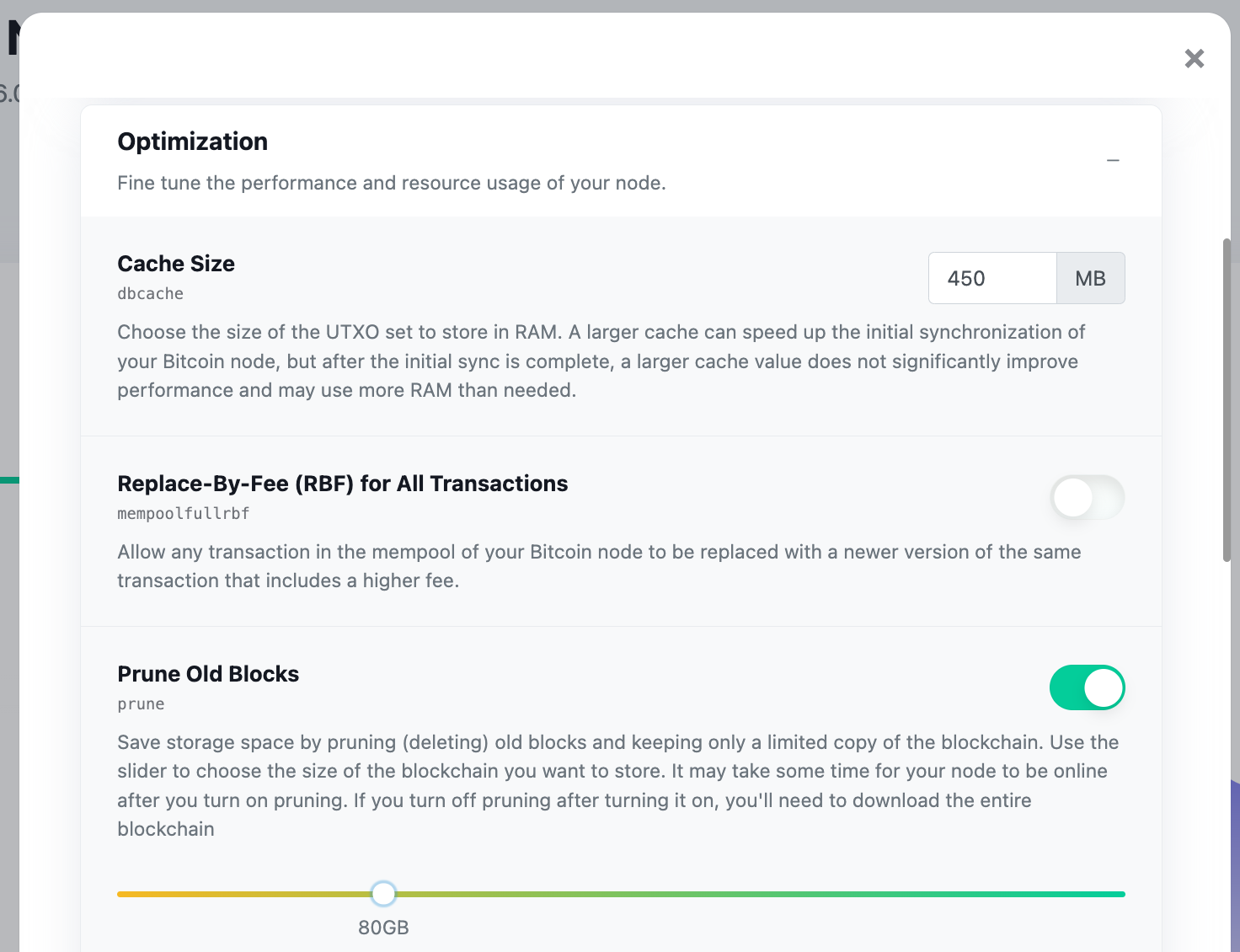 Bitcoin Nodeの設定からPrune Old Blocksを選択し、適度な数字を選択しましょう。例えば保管するブロックを直近300GBに設定すれば1TBのSSDでも500GBほど空き容量を確保できるでしょう。下のスクリーンショットは古いかもしれないので、実際の設定画面は異なるかもしれません。