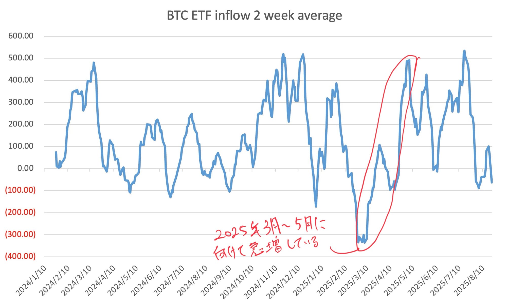 上記グラフは、北米のビットコインETFに流入した1日ごとの資金総量の2週間平均を示したものです。