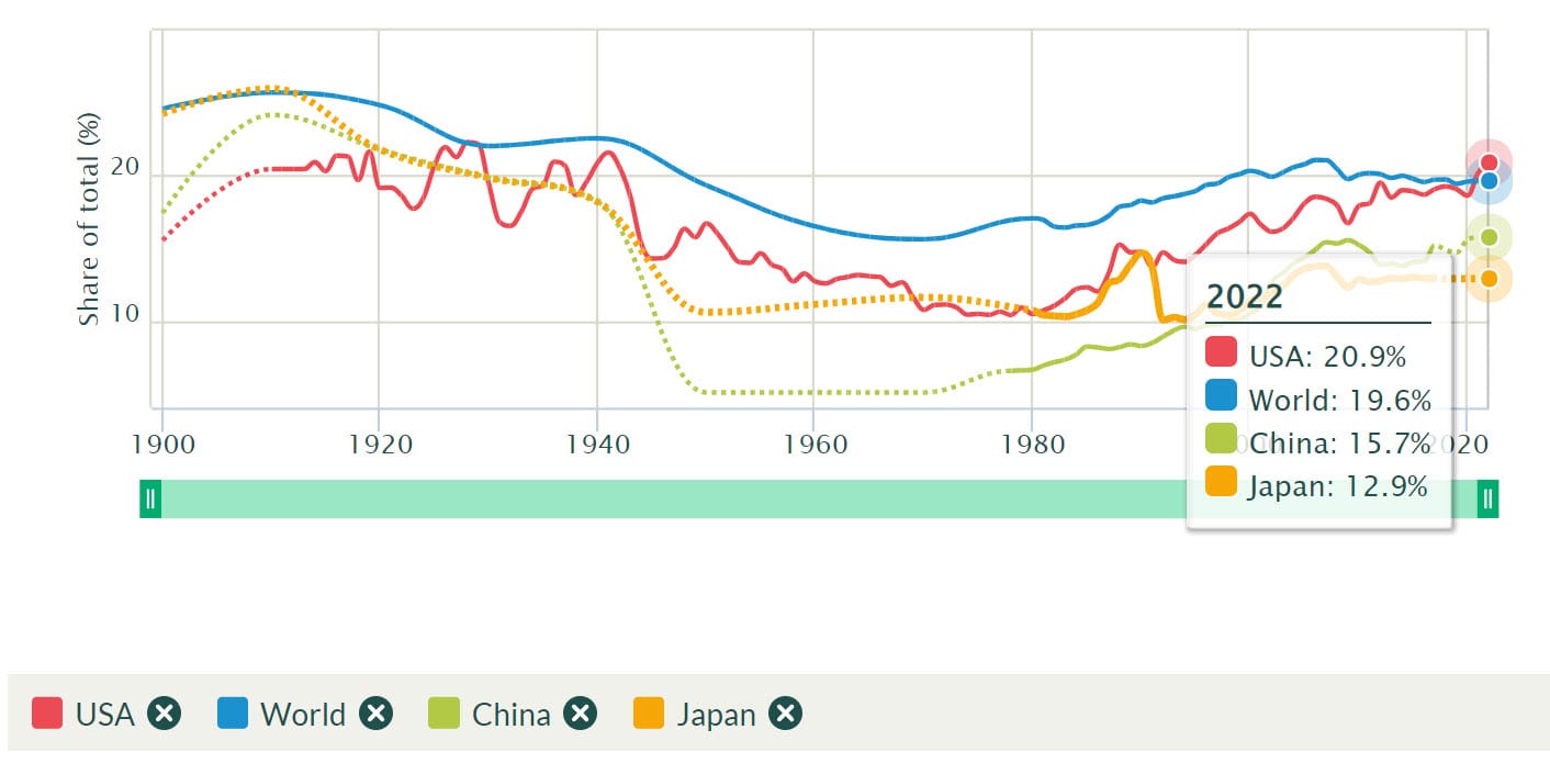 それが2022年には【世界平均19.6% vs. 米国20.9%】と逆転を果たしています。1900年以降で初めて、所得格差が世界平均を上回ったことになりますから、ちょっと気になる水準ではありますね。
