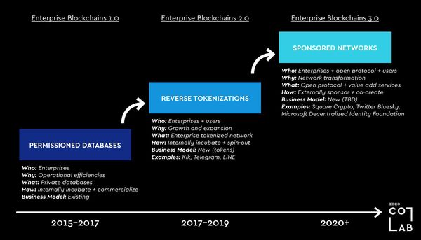 Enterprize blockchains1.0(トークンの否定と業務効率の改善)、Enterprize blockchains2.0(ICOや独自トークンプラットフォームの開発)