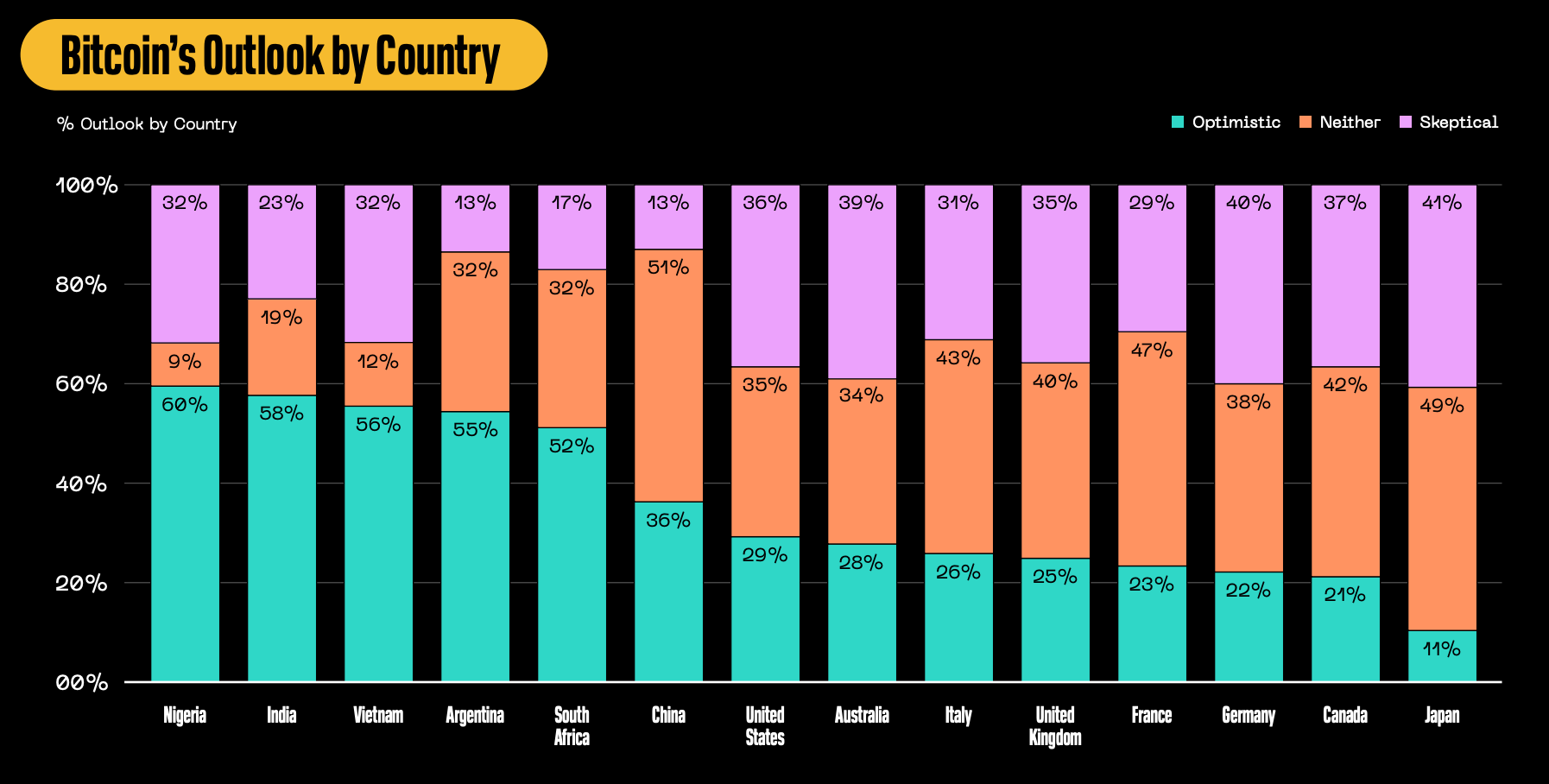 また、Block社の調査では「ビットコインの見通し」が指標でした。そして日本では中立の割合が49%と最も大きいです。「知らないから中立である」という考え方も納得がいくように思います。もちろん悲観の割合も大きいですが他国と大きな差はないように見えます。(2022年は相場的にも悲観ムードだったと考えられます)