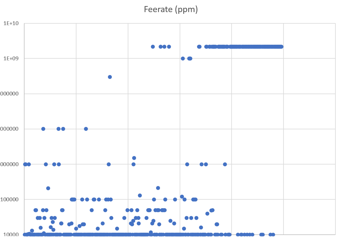 一般的にFeerateは0.1% (1000ppm)が規定値とされ、日常的に見る範囲としては0~0.5% (0~5000ppm)あたりが多いです。今回は1% (10000ppm)以上のチャネルを抽出してみました: