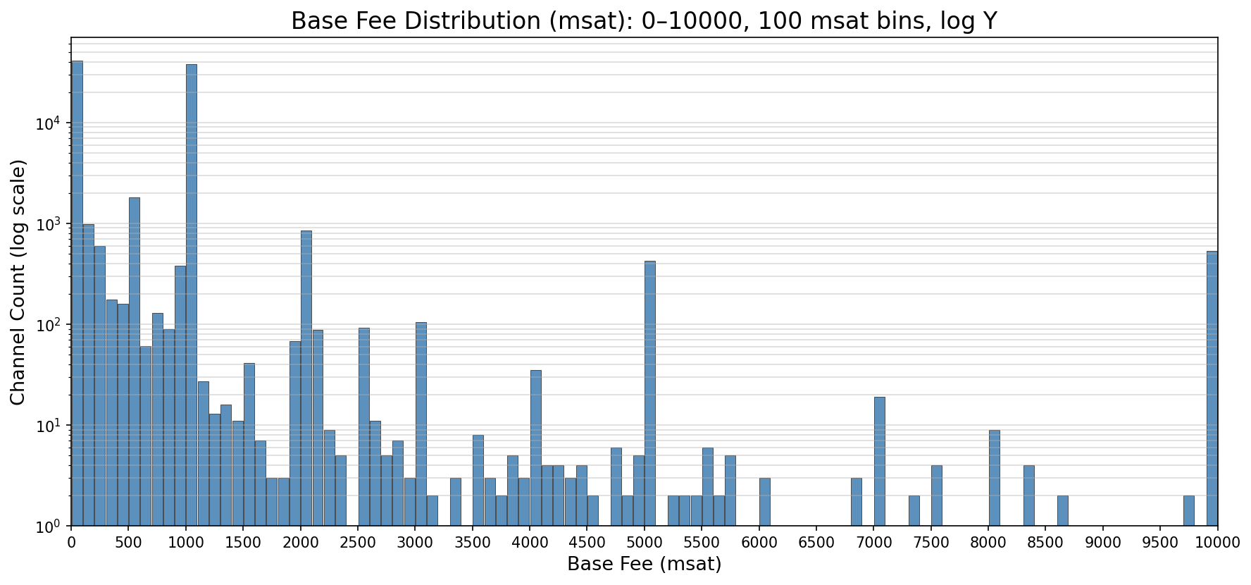 横軸はBase_fee(msat)、縦軸はチャネル数を表しています。一見すると切りのいい数字である0、1000、2000、5000、10000msatに設定しているチャネルが多いように読み取れるかもしれませんが、少し注意が必要です。縦軸がログスケールであるため実際のチャネル数とグラフの見た目には大幅な乖離が存在します。