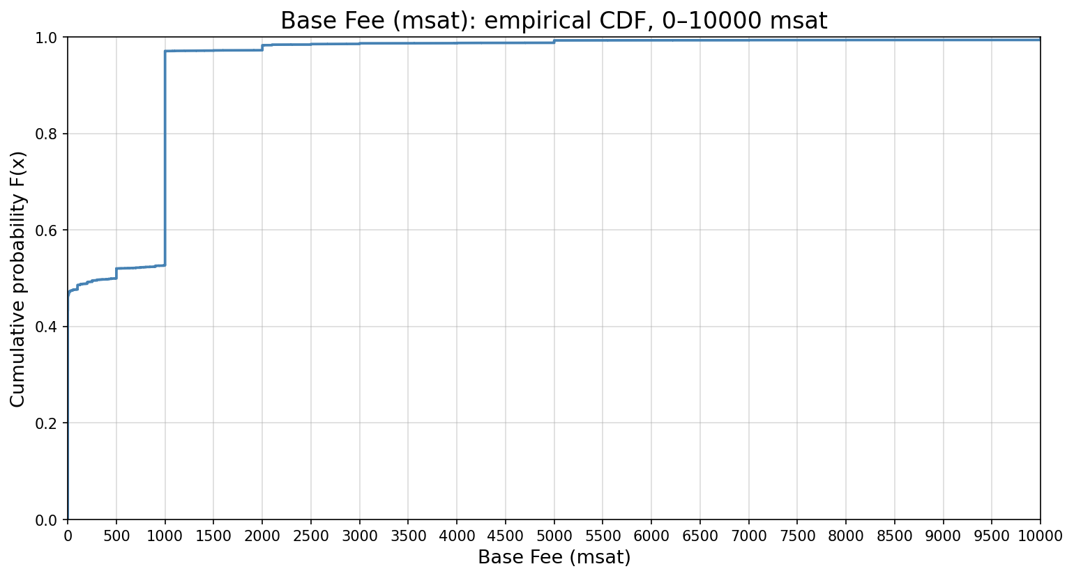 次に多い1000msatに関しては、多くの実装でBase_feeの値がデフォルト1000msatであるという理由が挙げられます。また経験則として1000msatまでならLNのノードの多くが設定しているため、Base_feeで確実に1000msatは稼ぎたいという気持ちもありそうです。