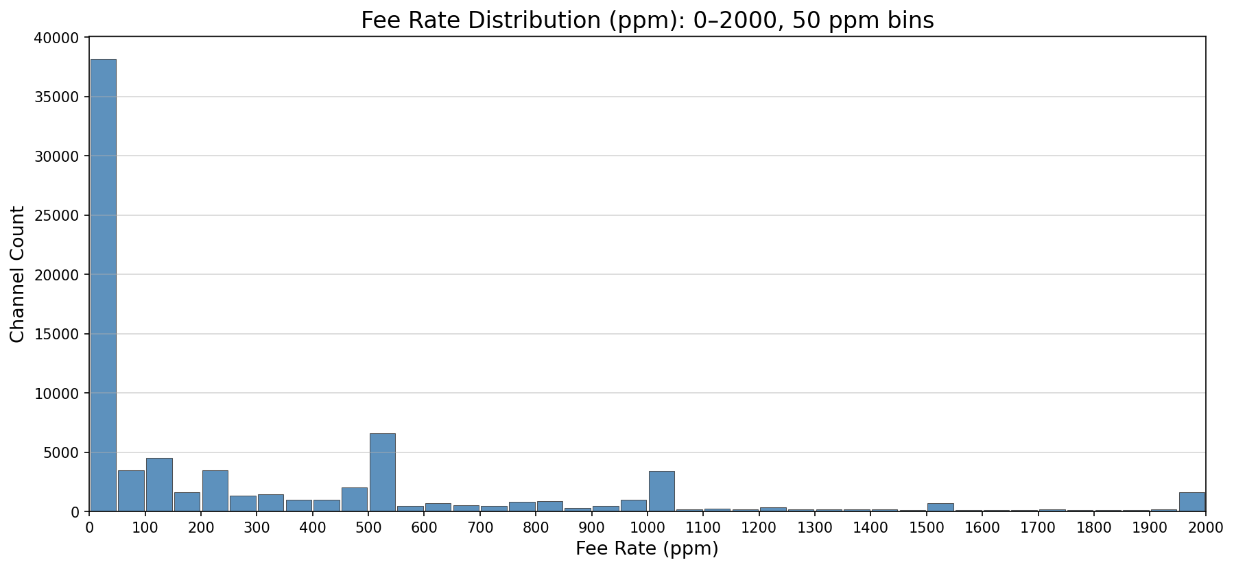 横軸はFee_rate(ppm)、縦軸はチャネルの数を表しています。今回の縦軸はログスケールさせていないので実際の数になります。グラフは50ppmごとに描画しています。