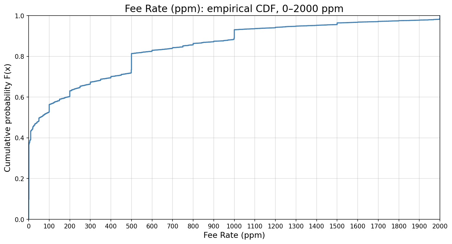 Fee_rateは約45%が1ppm以下、約98%が2000ppm以下であり、ルーティング需要の有無に応じて1ppm・500ppm前後・それ以上と段階的に使い分けられている傾向が見られました。