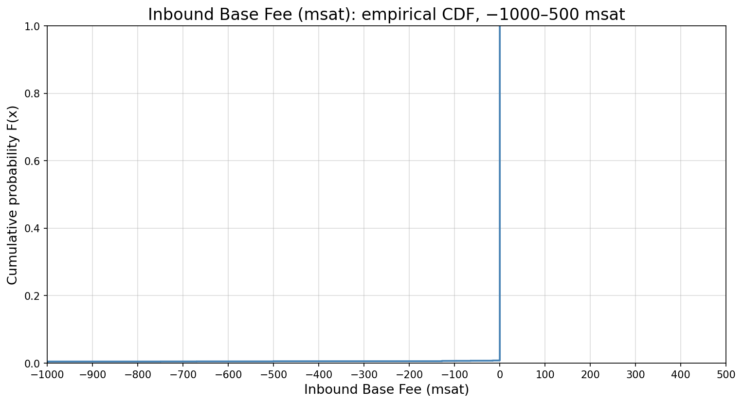 インバウンド手数料についてはInbound_base_feeはほぼ0msatである一方、Inbound_fee_rateは約7%がマイナス値を設定しており、従量割引による経路選択の優位性確保に活用されていると推察されます。