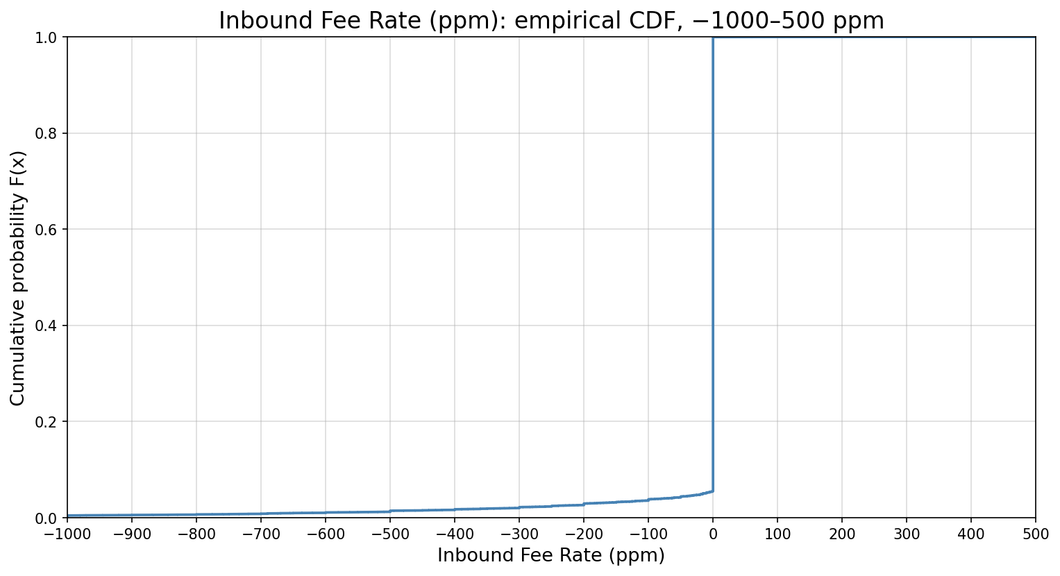 本稿ではお馴染みとなっている累積分布図です。上の図はInbound_base_feeで、下の図はInbound_fee_rateを表しています。