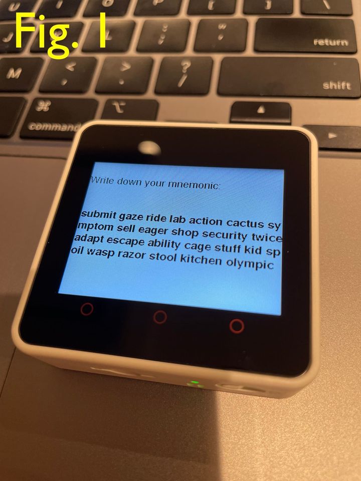 作成したプログラムをM5Stack Core2に書き込むと,Fig. 1のようにニモニックが出てきます。実際にM5Stack Core2内で秘密鍵生成をしてフラッシュメモリに保存しています。秘密鍵生成にはESP32に搭載されている乱数生成器を使用しているようです。