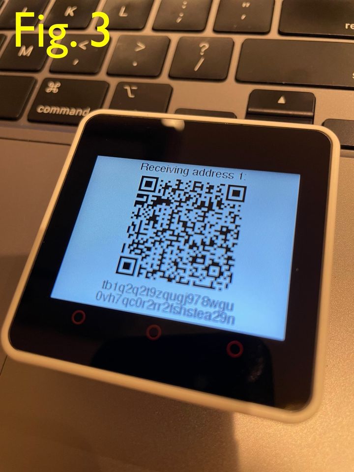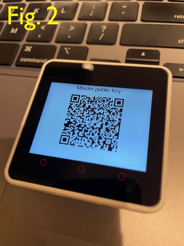 静電容量式のボタンを押していくと,Fig. 2, 3のように公開鍵が表示されます。シンプルですね。スマートフォンのウォレット等経由でQRコードを読み込むことができます。