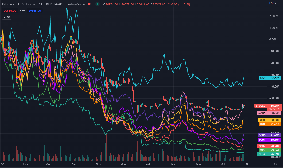 年初来の変動率を表した上記のチャートにおいて、BTCと同程度のドローダウン(-55%)で済んでいるのはMarathon Digital (MARA -58%)のみです。