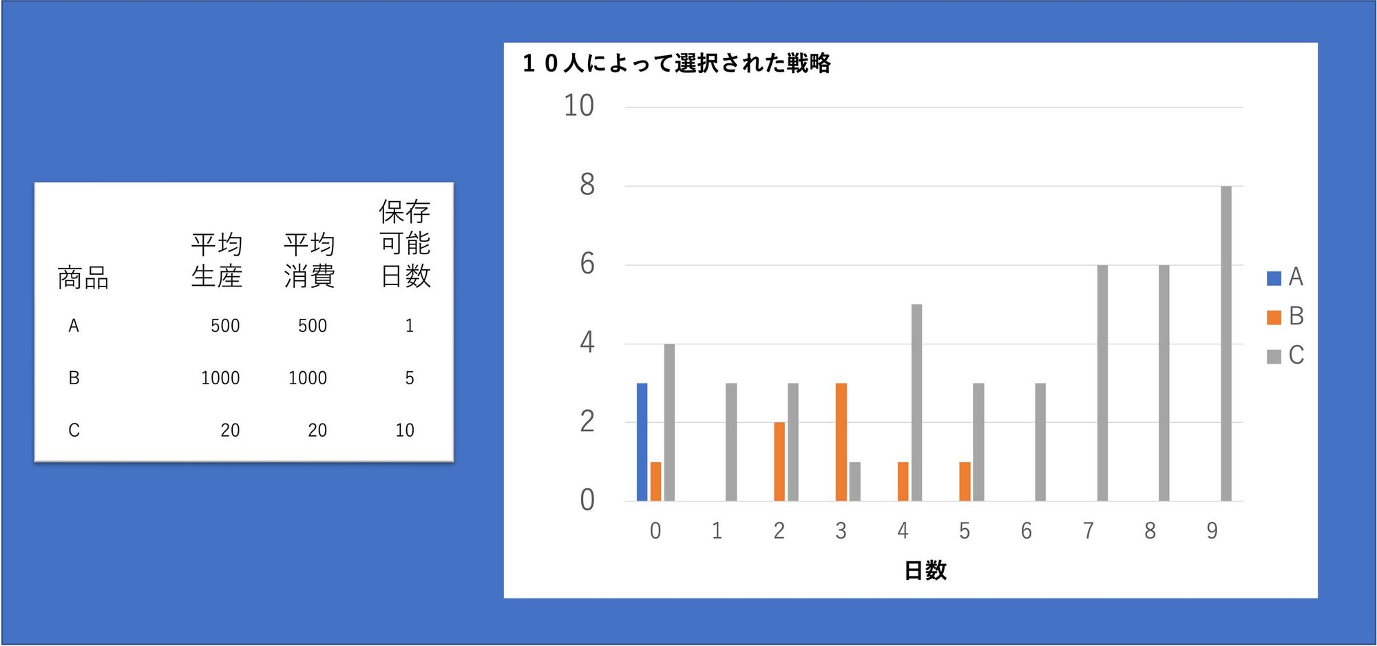 最初は色々な戦略があったのですが、次第に、Cのユニットを手放す戦略を取るようになりました。このケースの場合は、保存可能期間が効いているように見えます。長期保存可能なほど余剰がうまくできやすいということです。確かにストック可能な期間が長いものが若干余りやすくなると思います。表にはしませんが、逆に、Aが一番不足する傾向が多かったです。