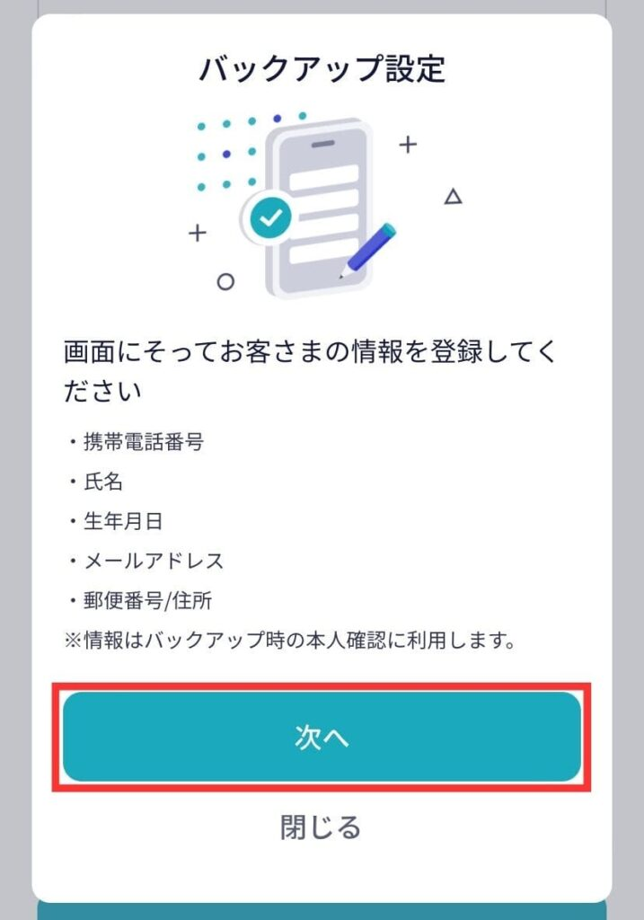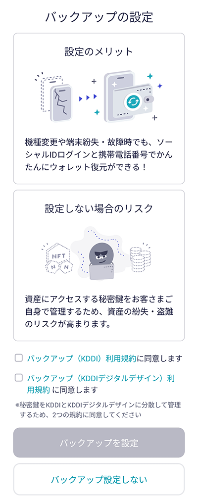 まずウォレットをセットアップするとき、秘密鍵の生成後に「バックアップ機能」を使うかを選択できます。選択しなければ、通常通りシードフレーズが表示され、書き留めるように促されます。しかし、バックアップ機能を使用する場合はKDDI社・KDDIデジタルデザイン社の2つの利用規約に同意し、シードフレーズを秘密分散してこの2社にバックアップします。その後シードフレーズを確認しようにもアプリ内ではどこにも表示してくれません。