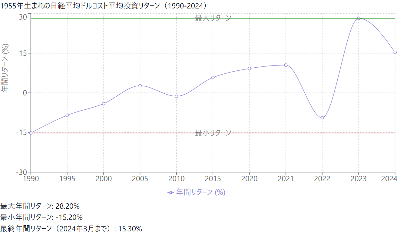 さて、ここからが大きな分岐点です。以下のグラフは、1955年生まれの方が35歳から日経平均指数をドルコストで買い続けた場合の平均投資リターンです。