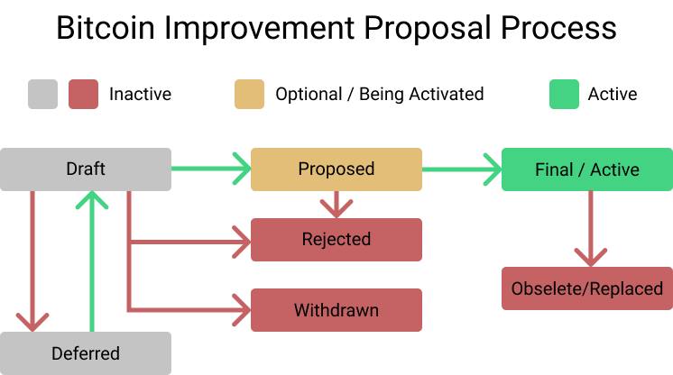 が、それぞれのステータスには明確なプロセスがあるわけではなく、多数決できめるわけでもなく、基本的には開発者のコンセンサスがとれた(つまりほぼ全員一致)になった時点できまります。ですので、いつどれがどのように採用されるかはわかりません。ずっと前に提案されているが、あまり話題にならずずっと放置みたいなBIPもいくつかあります(そして取り下げになったりする)