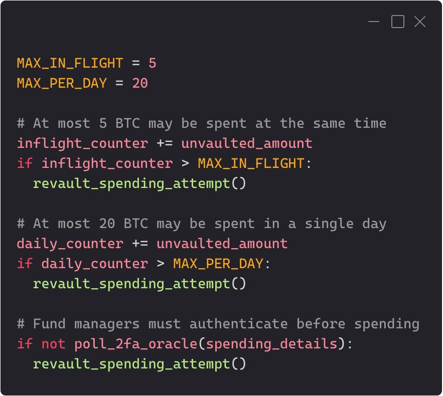 むしろ、ステークホルダーが課す制約の内容をビットコインスクリプトで定義する必要がないため非常に柔軟なスマートコントラクト機能を実現できるとも考えられます。例えばRevaultのウェブサイトでは1回のトランザクションの送金金額だけでなく、1日の送金金額やマネージャーの2要素認証を必須にする例が提案されています。